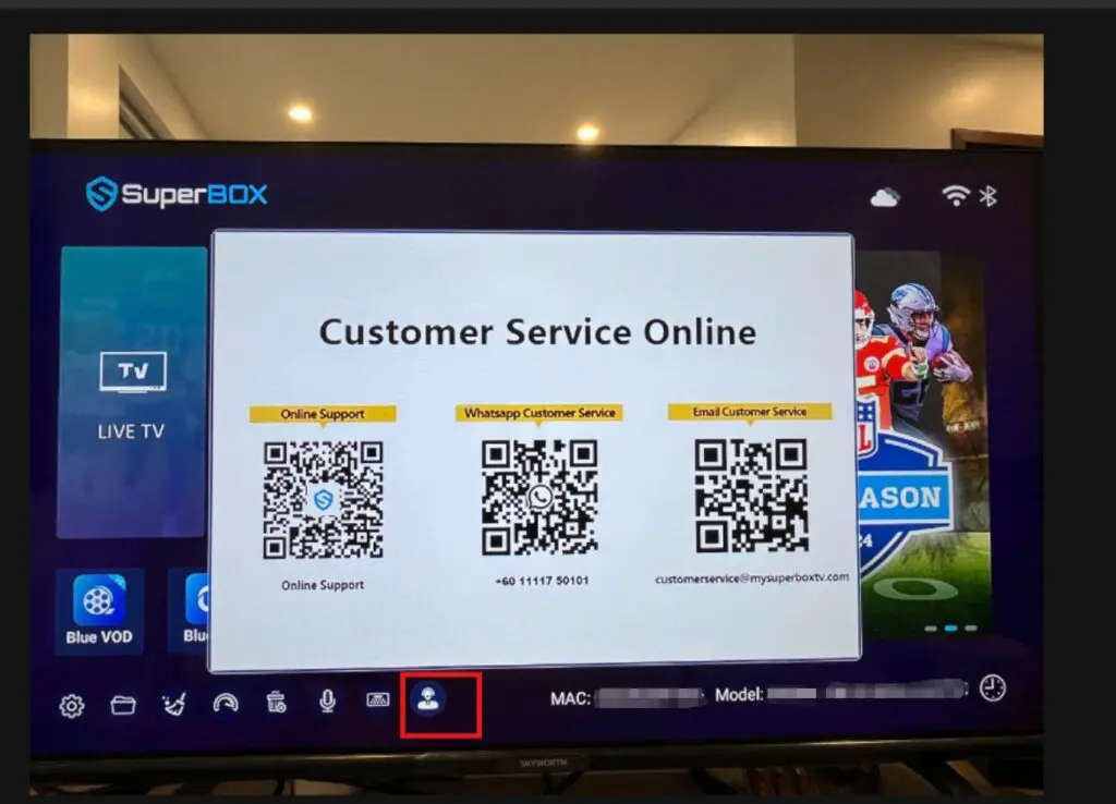 Do you know that SuperBox company offers 24/7 customer service for our products?. If you come across any problem during watching, you can reach our technical support directly through the (Customer Service Gear Icon) from your SuperBox home page screen. See the image below.