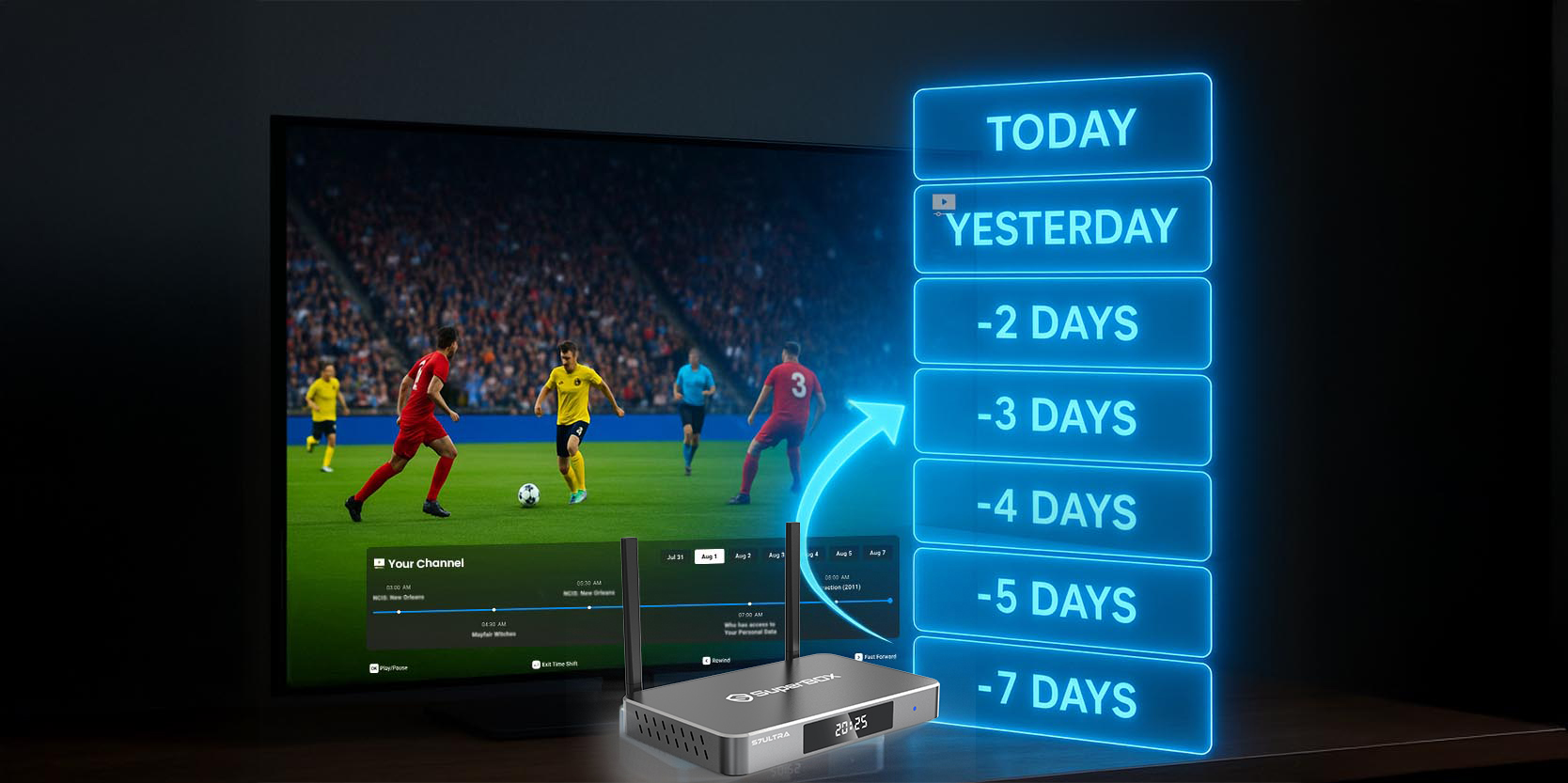 Another transformative feature is the extended Time-Shift function. Traditional streaming boxes may let you pause or replay live content, but the SUPERBOX S7 ULTRA takes it further. Its Time-Shift capabilities allow viewers to pause, rewind, and fast-forward live TV with extended memory. Don’t miss key moments during sports matches or live events—rewind and relive the excitement at your convenience. This function is a boon for families and sports enthusiasts, ensuring you never miss a highlight.